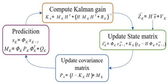 Now, to improve the estimation of the measured variable from the noisy sensors, the Kalman filter is implemented through sequential steps: (i) the estimation or prediction of the system behavior from the nonlinear equations; (ii) the calculation of the Kalman gain to reduce the error of the prediction of the current state versus the previous state, and (iii) the update of the measurement matrix, as well as the covariance associated with the uncertainty of the system. The representation from the selected state variables corresponds to the following equation: