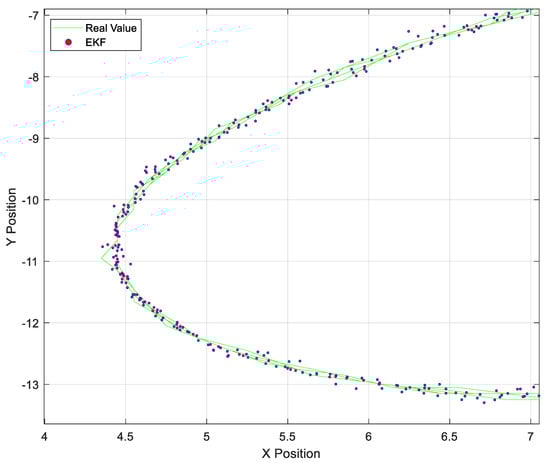 The response of the EKF to significant changes in the angular velocity of the target, represented as a change in the direction of the trajectory on the x-axis, is presented below. The EKF succeeds in predicting the target (green band), even at the point of greatest deflection. The zoom of the filter’s response to the change in trajectory is shown in Figure 8. The EKF was tested with the help of a dataset that provides 1225 positions and angles from simultaneous Radar and LiDAR measurements, where the Radar sensor provides the distance along with the angle of displacement, concerning the horizontal of the Radar, and also the angular velocity detected by the Radar; the LiDAR sensor gives the position in x and y coordinates. This dataset was contaminated with AWGN by increasing the noise power progressively and testing the EKF.
