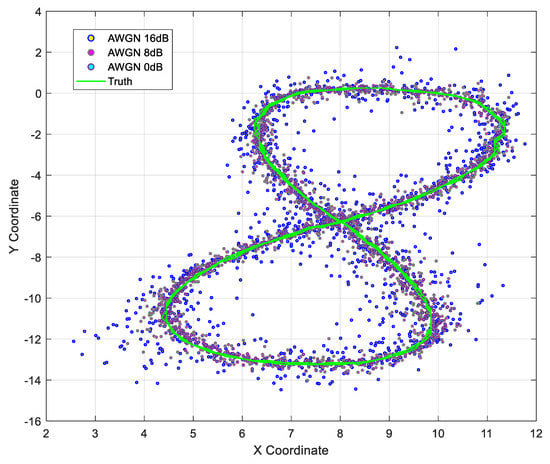 The plot of x and y position values for a 16 dB AWGN-contaminated LiDAR and Radar fusion.