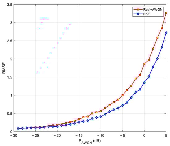 Figure 10 shows that the EKF acts by reducing the difference between the real values (red signal) and the values contaminated with Gaussian noise (blue signal). In [], the authors state that the RMSE response can be improved with the unscented Kalman filter; however, it should be noted that this filter implies a higher computational complexity concerning the EKF. On the other hand, the response of the KF with a linear model and increasing AWGN is shown in Figure 11.