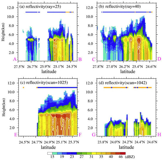 Figure 2. Vertical sections of the radar echo along lines (a) AB, (b) CD, (c) EF, and (d) GH in Figure 1d. The X axis represents the latitude along the cross-section direction. The yellow and blue dots at the 11 km altitude represent the convective and stratiform precipitation retrieved from the dual-frequency method in GPM, respectively.