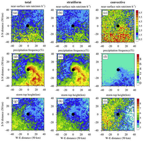 Figure 3. The distribution of (ac) near-surface rain rate (shading, mm h−1), (df) precipitation frequency (shading, %), and (gi) storm-top height (shading, km) for total, stratiform, and convective precipitation at each 50 km × 50 km grid in the NCCV coordinate system, derived from GPM DPR for 2014–2019. (The black dots represent the NCCV center; 6432 NCCVs are included in the dynamic composite analysis).