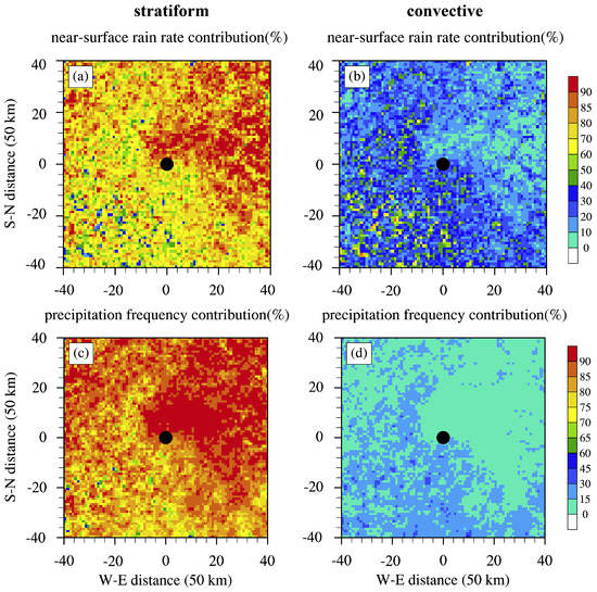 Figure 4. The distribution of (a,b) precipitation contribution (shading, %), and (c,d) precipitation frequency contribution (shading, %) for total, stratiform, and convective precipitation at each 50 km × 50 km grid in the NCCV coordinate system, derived from GPM DPR for 2014–2019. (The black dots represent the NCCV center; 6432 NCCVs are included in the dynamic composite analysis).