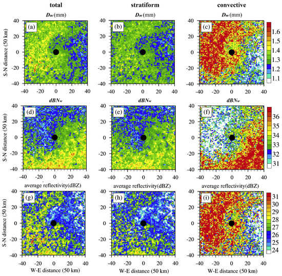 Figure 5. The distribution of near-surface (ac) droplet mass-weighted mean diameter Dm (shading, mm), (df) particle concentration parameter dBNw (shading, no unit), and (gi) average reflectivity (shading, dBZ) for total, stratiform, and convective precipitation at each 50 km × 50 km grid in the NCCV coordinate system, derived from GPM DPR for 2014–2019. (The black dots represent the NCCV center; 6432 NCCVs are included in the dynamic composite analysis).