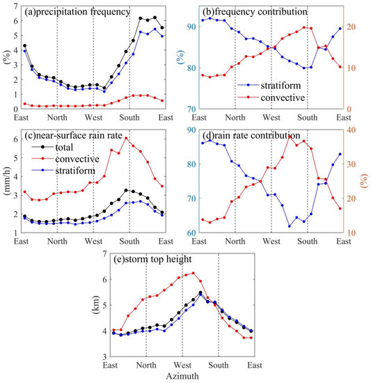 The peak value of precipitation frequency is in the southeast quadrant of the NCCV for different rain types (Figure 6a). In each direction of the NCCV, the frequency of stratiform precipitation is greater than that of convective precipitation. This indicates that the NCCV precipitation is dominated by stratiform precipitation, which is consistent with the horizontal distribution (Figure 3e,f). The convective precipitation frequency changes slightly in the northern half of the NCCV, while it gradually increases from west to southeast, and then gradually decreases to the east. The peak of the precipitation frequency is about 1% in the southeast of the NCCV. The frequency of stratiform precipitation varies greatly in different directions of the NCCV. From the east side of the NCCV to the southwest, the frequency of stratiform precipitation gradually decreases and reaches the minimum in the southwest of the NCCV, about 1.3%. Then to the southeast, the frequency of precipitation increases rapidly and reaches the peak in the southeast of the NCCV, about 4%. The azimuthal distribution of the total precipitation frequency is basically consistent with that of stratiform precipitation but is larger than that of stratiform precipitation in each direction.