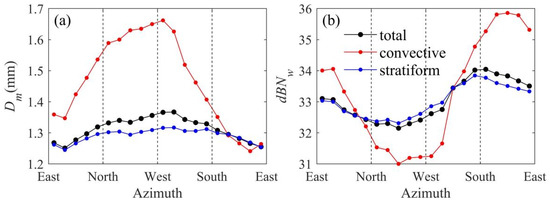 Figure 7a,b shows the azimuthal distribution of near-surface Dm and dBNw of the total, stratiform, and convective precipitation in the NCCV. The Dm for different types of precipitation shows obvious asymmetry, and the azimuth distribution characteristics are similar (Figure 7a). The peak values are in the west of the NCCV, and the valley values are in the east. Except for the southeast quadrant, the Dm of convective precipitation is generally larger than that of stratiform in all directions. The Dm of convective precipitation changes the most in different directions within the NCCV (the asymmetry is more obvious). From the east side of the NCCV to the west side, the Dm gradually increases and continues to the east side, where the Dm gradually decreases. The peak value in the west is about 1.66 mm, and the valley value is in the southeast, about 1.24 mm. For stratiform precipitation, the average azimuthal variation of Dm is small, with a peak of about 1.32 mm in the west and a valley of about 1.25 mm in the east. The Dm distribution of total precipitation is similar to that of stratiform precipitation.