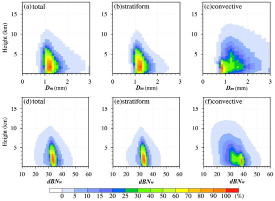 Figure 12. The contoured frequency (shading, %) by altitude diagram of Dm and d B N w for (a,d) total, (b,e) stratiform, and (c,f) convective precipitation within 2000 km distance of the NCCV center, derived from GPM DPR for 2014–2019.