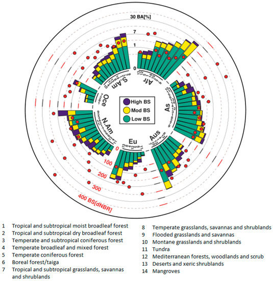 Mean values of burned area (BA), burn severity (BS), and BA by BS levels by regions (biomes × continents) for the period 2003–2019. BA values are represented by square root scaled bars and expressed in percentage with respect to the total extent of the regional land surface. The percentage of the BA burned at each BS level is proportional to their fraction within the BA bars. BS is represented by red points and expressed in dNBR units ranging from −2000 to 2000. S.Am: South America, Oce: Oceania, N.Am: North America, Eu: Europe, Aus: Australia, As: Asia, Afr: Africa.