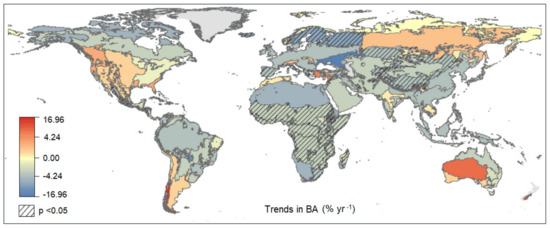 World BA decreased −1.50% year−1; p < 0.01 which in absolute terms is equivalent to a decrease of 1.22 MKm2 between 2003 and 2019 (25.5% less BA with respect to 2003) (Table 1). These results elucidate an intensification of the decline in BA compared to the results already reported for the period 2003–2015 [4]. Analyzing BA trends by regions (Figure 2; Table A2), we found significant BA decreases in the European taiga (−6.21% year−1; p = 0.04), temperate grasslands, savannas and shrublands of Asia (−2.77% year−1; p = 0.01), Mediterranean Europe (−2.31% year−1; p = 0.03), tropical and subtropical dry broadleaf forests of North America (−2.11% year−1; p < 0.01), montane grasslands and shrublands of Africa (−2.08% year−1; p < 0.01) and Asia (−1.93% year−1; p = 0.02), and in most of tropical Africa including grasslands, savannas and shrublands (−1.64% year−1; p < 0.01), moist broadleaf forests (−1.57% year−1; p = 0.02) and mangroves (−1.37% year−1; p = 0.02). Generalized decreases in BA have been formerly attributed to a decrease in the number of ignitions and to a lesser extent, to decreases in fire size, driven by human activity [4]. In this sense, the increase in human population, cropland area, and livestock density cause decreases in fire activity in the fire-prone open biomes [4], whereas increased efficiency in fire prevention, detection, and extinction, and abandonment of fire use in agriculture contribute to the decreasing trend in other regions [7,50].
