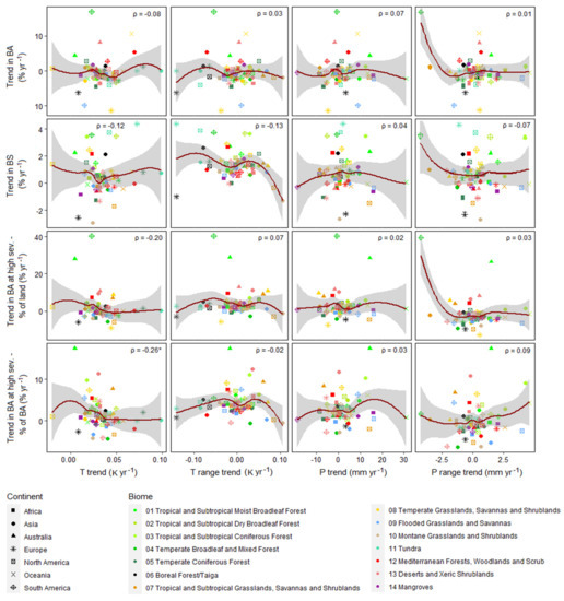 Scatterplots showing the relationship between the studied climate trends and normalized trends (value in 2003 = 100%) in fire variables for the period 2003–2019. Red lines show the local polynomial regression fitting (loess), and shaded areas ±95% confidence intervals. Each panel also shows the Spearman’s correlation coefficient (ρ), and the number of asterisks denotes the level of statistical significance (p < 0.05, p < 0.01, and p < 0.001). BA: burned area, BS: burn severity, T: mean annual temperature: T range: annual temperature range, P: annual precipitation, P range: and annual precipitation range.
