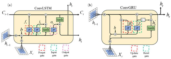 The structure of ConvLSTM and ConvGRU neural networks. (a) ConvLSTM; (b) ConvGRU.