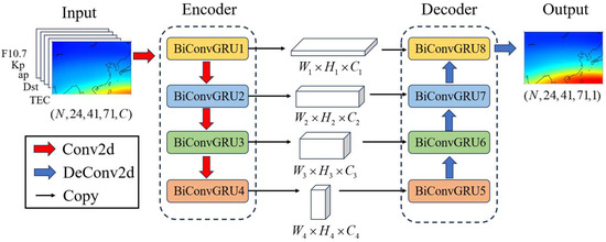 The BiConvGRU model adopts an encoder–decoder network structure, as shown in Figure 3. The input of the BiConvGRU model is a tensor of (N, 24, 41, 71, 5). Each BiConvGRU layer is connected by a Conv2d layer (red down arrow) in the encoder, and by DeConv2d (blue up arrow) layer in the decoder [46]. The decoder network copies (black arrow) its initial state from the encoder network. It should be noted that the input tensor of the decoder is the output tensor of the encoder. For example, the input tensor of the BiConvGRU5 in the decoder is the output tensor of BiConvGRU4, which captures information from all 24 maps in the hidden state to generate forecasted TEC maps for the subsequent day. In conclusion, the decoder can be considered as the symmetrical reverse of the encoder. TEC spatio-temporal complexity can be better learnt by the model through stacking BiConvGRU layers in the encoder. Each BiConvGRU layer is equipped with a Batch Normalization layer to avoid overfitting and restriction. Finally, the multi-channel output sequence of BiConvGRU8 is converted to a single-channel output using a deconvolution layer with a kernel size of 1, generating the forecasted CRIM for the next day.