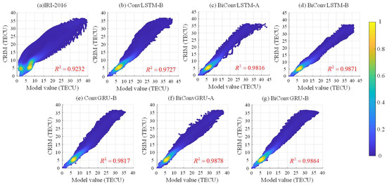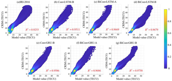 Figure 12 presents a correlation analysis between the 24 h TEC predictions of the various models and the CRIM TEC values for DOY 238. Figure 11a–g display the scatter density plots of the IRI-2016, BiConvLSTM-A, BiConvLSTM-B, ConvLSTM-B, ConvGRU-B, BiConvGRU-A, and BiConvGRU-B models with CMONOC TEC, respectively.