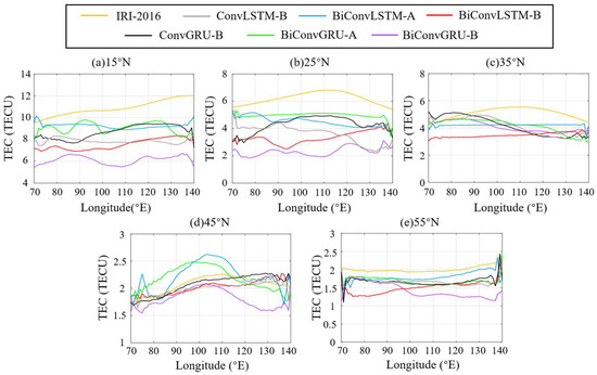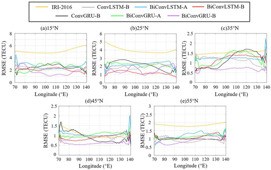 Figure 8 showcases the RMSE variation of the IRI-2016, ConvLSTM-B, ConvGRU-B, BiConvLSTM-A, BiConvGRU-A, BiConvLSTM-B, and BiConvGRU-B models with longitude across various latitudes on DOY 233. Figure 8a–e correspond to latitudes 15°N, 25°N, 35°N, 45°N, and 55°N, respectively. Table 4 summarizes the RMSE values for these seven models at different latitudes.