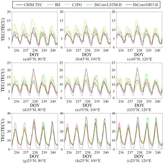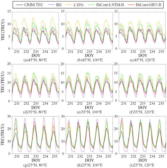 To further assess the forecast accuracy of the proposed models for quiet-day TEC, interpolation was conducted using the 1-day Predicted GIM (C1PG) data provided by the CODE center. This enabled TEC predictions for nine specific grid points at various longitudes and latitudes within the Chinese region for DOY 231–235. A comparative analysis was then performed using the TEC predictions of the IRI-2016, BiConvLSTM-B, and BiConvGRU-B models at these corresponding grid points.