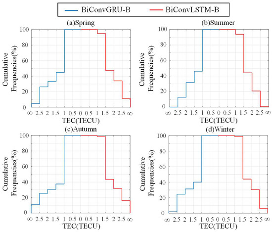 - An examination of the cumulative frequency of MAE for the BiConvGRU and BiConvLSTM models over different seasons showed that the BiConvGRU-B model had a significantly higher percentage of MAE within the range of 0–1 TECU compared to the BiConvLSTM-B model. Moreover, throughout all four seasons, the BiConvGRU-B model had a consistently lower proportion of MAE over 2.5 TECU compared to the BiConvLSTM-B model.