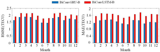 Figure 16 shows the comparative analysis of Root Mean Square Error (RMSE) for Total Electron Content (TEC) predictions between the BiConvLSTM-B and BiConvGRU-B models throughout the twelve months of 2018. It is evident that the BiConvGRU-B model consistently outperforms the BiConvLSTM-B model, exhibiting lower RMSE and Mean Absolute Error (MAE) values across all months. The most substantial improvement in RMSE is observed in July, with a remarkable decrease of 0.34 TECU, while the largest improvement in MAE is observed in November, with a significant decrease of 0.46 TECU. Over the entire year of 2018, the BiConvLSTM-B model demonstrated an RMSE of 2 TECU and an MAE of 1.62 TECU, whereas the BiConvGRU-B model achieved an RMSE of 1.71 TECU and an MAE of 1.22 TECU. Comparatively, the BiConvGRU-B model showed a notable reduction of 14.5% in RMSE and 24.7% in MAE compared to the BiConvLSTM-B model, thereby establishing its superiority in terms of accuracy and stability for long-term forecasting purposes.