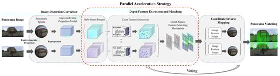 35] through the Equirectangular Projection Model. Then, the Improved Cube Projection Model is used to transform the panoramic sphere in different directions and reproject the panoramic image onto the perspective image with slight distortion in six directions (front, back, left, right, top, and bottom) to realize the correction of the panoramic image. The Superpoint (SP) deep feature extraction algorithm is used to extract features from all directions, and the graph neural network Superglue (SG) matching algorithm is used to search and match the extracted features. The best matching-point pairs are output, and the algorithm is accelerated by processing six split-frame images simultaneously. Finally, the matching points on the image in each direction are mapped back to the panoramic image via coordinate inverse mapping. The solution framework of the matching algorithm is shown in