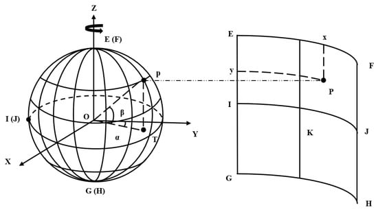 J) of the panoramic image corresponding to the latitude and longitude are found in the panorama using the Equirectangular Projection Model. Using Formula (11), the coordinates of the feature points of the perspective image can be mapped back to the panoramic image.