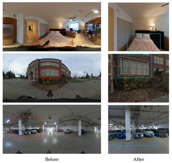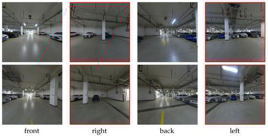 Although the proposed method in this paper achieved a good performance level, there are still several limitations in our method. Because the proposed algorithm reprojects the panoramic image onto split-frame images in different directions, the corresponding directional split-frame images are matched one-by-one. Therefore, it is not suitable for images with different imaging modes. When composing a panoramic image, one imaging mode is that the image captured by the forward-facing lens is in the center of the panoramic image; the other imaging mode is that the image captured by the forward-facing lens is at the edge of the panoramic image. When the proposed algorithm was tested on such images, the results were unsatisfactory.