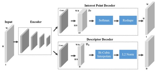 Figure 8. The SP Extract Feature Network algorithm consists of three modules: the Encoder, Interest Point Decoder, and Descriptor Decoder. The Encoder is built from a lightweight fully convolutional network modified by