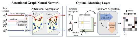 The six split-frame images of the two panoramic images after the SP algorithm has extracted the deep features are matched using the SG algorithm for deep features. The framework of the SG algorithm is shown in