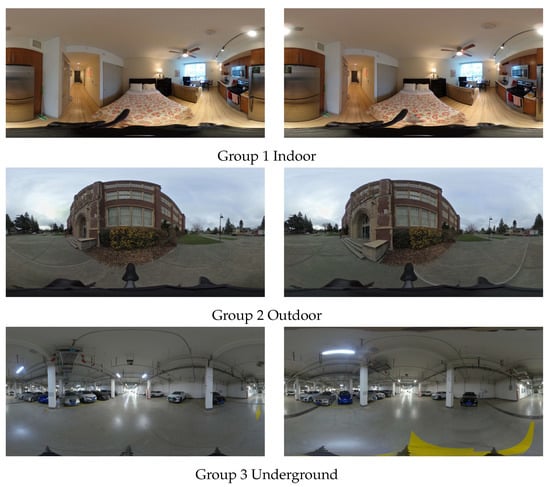 Table 1. Three types of test data were used: indoor panoramic images, outdoor panoramic images, and underground panoramic images. The resolutions were identical, but the types of images differed, giving very representative data for the test algorithm.