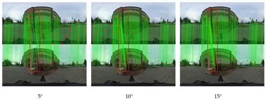 Figure 14. A comprehensive analysis indicated that the 10° extension angle achieved better results for image matching than the 5° extension angle at the expense of a lower time efficiency. The 15° extension angle increased the number of matching points slightly compared with the 10° extension angle, but the time efficiency decreased significantly. Therefore, in subsequent experiments, the 10° extension angle was adopted.