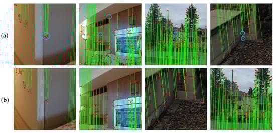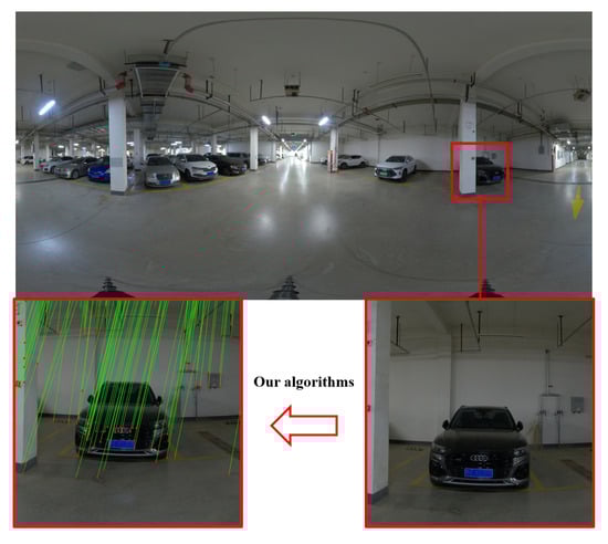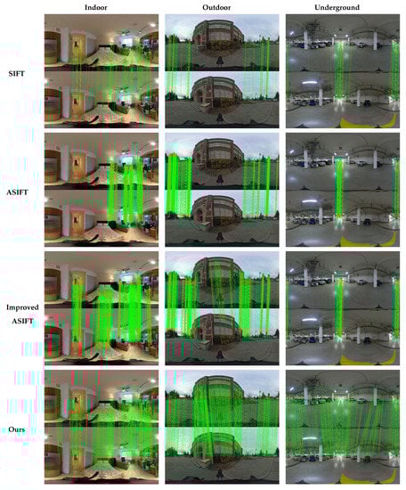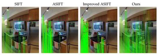 Figure 17, several other algorithms do not extract features or extract fewer feature points in the region with large indoor distortion. The proposed algorithm extracted uniform and dense feature points in the area with large indoor distortion and performed well.