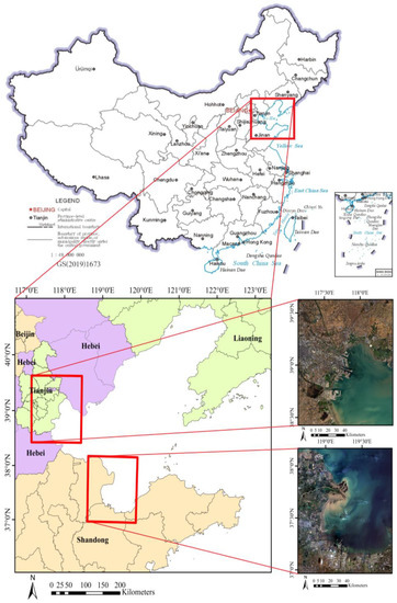 As an important region in China, Bohai Bay is famous for its developed industry and has rich natural resources [19]. It experiences a monsoon climate throughout the year in northern China, and saltpans are mainly distributed around the north of the Bohai Sea. Two study areas in Bohai Bay, North China Plain, and Northern Shandong, China, are selected. They are referred to as the Tianjin Region and the Dongying Region, as shown in Figure 1.