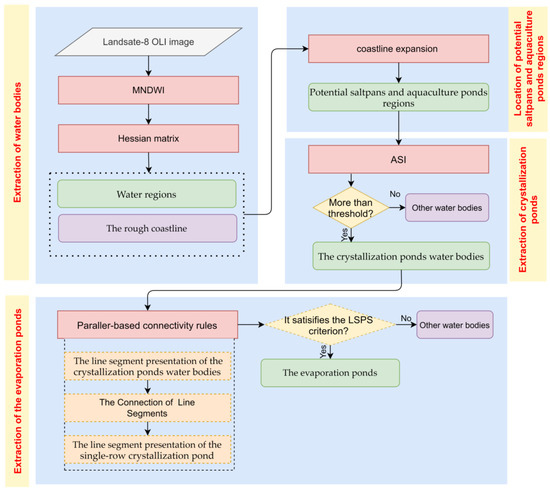 The flow chart of the proposed method is shown in Figure 2. The flow chart consists of four steps: (1) the extraction of water bodies, (2) the location of potential saltpans and aquaculture ponds regions, (3) the extraction of crystallization ponds, and (4) the extraction of evaporation ponds.