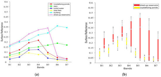 Spectral comparison of different land cover types. (a) The mean spectral curves of the six typical coastal ground objects, where each point denotes the average reflectance with all samples of each type in one band. (b) The comparison of the bar chart of dried-up reservoirs and crystallizing ponds from band B1 to band B7 by all samples in both types. For each bar chart, the positions of the 10th and 90th percentiles are displayed using level lines, and the range from the 25th percentile (Q1) to the 75th percentile (Q3) is represented by the box in the box plot. The circles indicate the 5th, 50th, and 95th percentiles.