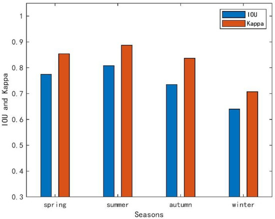 To intuitively study the impact on the performance of ASI-LSPS algorithm with four seasons, IOU and Kappa coefficients have been used for quantitative analysis, as shown in Figure 8. IOU in summer is greater than 80%. Similarly, Kappa coefficients in summer are around 90%. The IOU coefficients for both spring and autumn can be greater than 75%, and the Kappa coefficient is around 85%. The IOU and Kappa coefficients in winter decrease by approximately 10% in comparison to those of other seasons. The higher the value of the IOU and Kappa coefficient, the better the performance. Hence, the results show that the ASI-LSPS algorithm has better saltpans extraction performance in summer, while the extraction performance is reduced in winter because of sea ice.