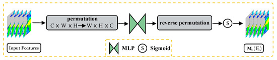 To elucidate the functionality of the channel attention mechanism employed in the GAM module, Figure 3 provides a schematic representation. A dimension transformation is performed on the input feature map before feeding it into the multilayer perceptron (MLP) [40]. Then, the transformed feature map is converted back to its original dimension and processed through sigmoid activation before being outputted. The resulting feature maps are enriched with informative channel-wise representations that contribute to the task performance.