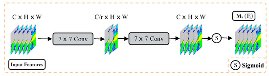 Figure 4 illustrates the spatial attention mechanism employed in the GAM module. The spatial attention mechanism employs convolution processing [41] to enhance its performance. This is achieved by reducing the number of channels through a convolution kernel, which reduces the computational requirements. The resulting feature maps are then increased back to their original channel count and outputted via the sigmoid activation function. To ensure maximum information utilization, the max pooling operation is eliminated from the process. These modifications significantly improve the network’s performance by enriching the feature maps with more informative spatial representations.