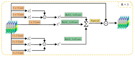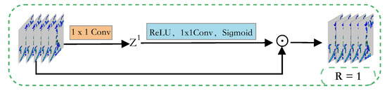 where , , ⊙ is elementwise product. Then, add the generated to the ReLU activation function and a 1 × 1 convolutional layer, and combine the obtained features into the sigmoid activation function, which can be expressed as