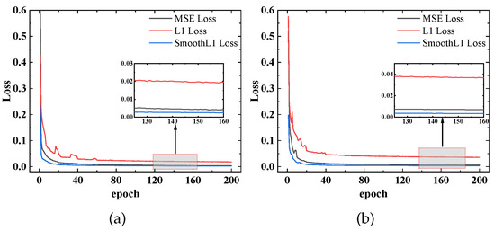 Figure 7 shows the comparison of the loss function convergence effects. We conducted the experiments with our method with different loss functions and data downsampled with the same downsampling method and compared the results at various high-resolution scales.