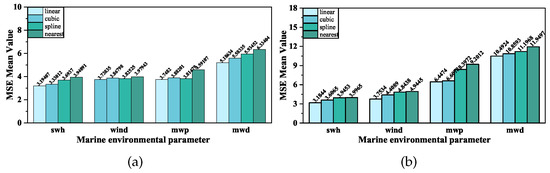 Figure 10 compares the mean MSE value of traditional interpolation methods when using different downsampling methods. The figure shows that for different marine environmental parameters, the best results are obtained when the data are downsampled using the alternate downsampling method. Therefore, when applying traditional interpolation algorithms to the data in the following text, we choose data that have been downsampled using the alternate downsampling method for interpolation.