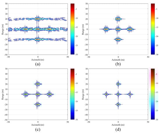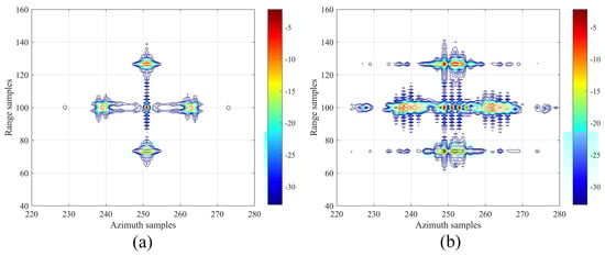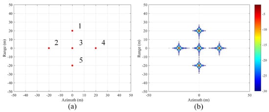 Firstly, in order to clearly demonstrate the focusing performance difference of the first PC AMD signal before and after being affected by phase error, we assume that there are five symmetrical targets in the scene and illustrate the corresponding and , as shown in Figure 1a and Figure 1b, respectively.