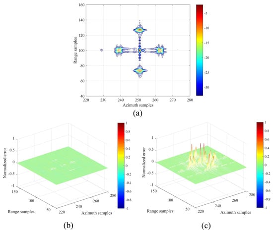 The focus performance is almost identical to the Figure 1a. Moreover, the normalized errors between the and , and the and are calculated to evaluate the autofocusing performance. The results are illustrated in Figure 2b and Figure 2c, respectively. This implies that the sparse presentation signal autofocusing method can effectively eliminate the residual phase error of , and obtain an identical focus performance of the Non-PE AMD signal . Therefore, the defocusing effect caused by phase error has been eliminated using the sparse representation signal autofocusing. The accuracy of the reconstructed complete echo is reliable.