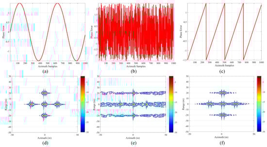 Then, we designed three different range-invariant phase error models, namely, the Sine function PE (S-PE) model, the Random PE (R-PE) model, and the Linear PE (L-PE) model, as shown in Figure 5a–c. The imaging results obtained by RDA for the S-PE, R-PE, and L-PE complete echo are illustrated in Figure 5d–f. It can be observed that the unknown phase errors lead to significant defocusing of the point targets in the image results.