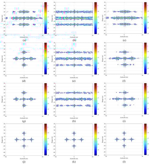 To verify the effectiveness of the proposed SRA-AMDIA in the periodic PE-AMD echo case, the following Figure 6 demonstrates the imaging results obtained by four different algorithms for three different PE models’ echo. Specifically, Figure 6a–c show the results obtained by imaging 50% periodic S-PE-AMD, R-PE-AMD, and L-PE-AMD echo directly using RDA, which can be named the RDA S-PE-AMD echo result, RDA R-PE-AMD echo result, and RDA L-PE-AMD echo result, respectively, for the sake of convenience. Figure 6d–f show the results obtained by SOA-AMDIA with the 50% periodic PE-AMD echoes, which are the SOA-AMDIA S-PE-AMD echo result, SOA-AMDIA R-PE-AMD echo result, and SOA-AMDIA L-PE-AMD echo result, respectively. Figure 6g–i illustrate the results obtained after autofocusing based on Figure 6d–f, which can be abbreviated as the SOA-AMDIA+Autofocusing PE-AMD echo results. Figure 6j–l demonstrate the results obtained by proposed SRA-AMDIA with the 50% periodic PE-AMD echoes. These stand for the SRA-AMDIA S-PE-AMD echo result, SRA-AMDIA R-PE-AMD echo result, and SRA-AMDIA L-PE-AMD echo result, respectively.