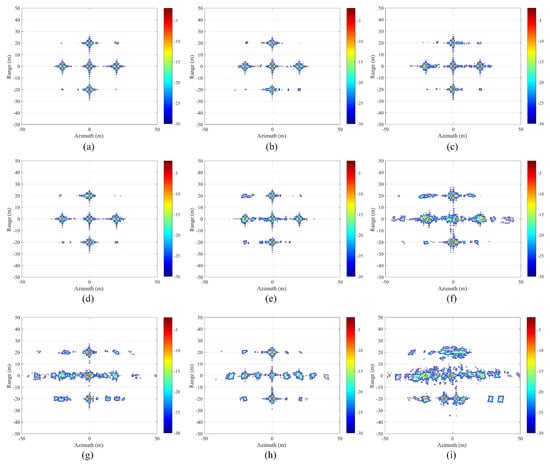 Observing Figure 8, as the AMR increases, the imaging performance of the proposed SRA-AMDIA gradually decreases. Especially when the AMR , the imaging performance of the proposed SRA-AMDIA is severely degraded. In the final imaging results, whether it is severe azimuth defocusing as shown in Figure 8f,i or false targets as shown in Figure 8g,h, they are all caused by the estimation error between the estimated complete echo and the true complete echo under the influence of phase errors. However, when AMR , the individual point targets in the scene can be well-focused. Although some side-lobes interference may appear in non-target areas, these side-lobes are mostly below -25dB, so they do not have a significant impact on the image discrimination. Therefore, the proposed SRA-AMDIA can achieve an excellent imaging performance when AMR . This AMR threshold can already handle most missing data situations. The impact of different AMRs on the imaging performance of the proposed SRA-AMDIA has been analyzed.