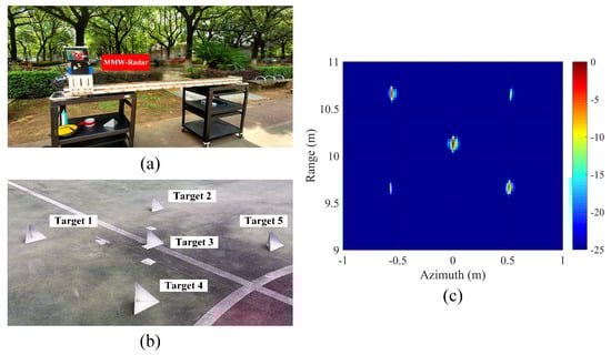 (a) Layout of the experimental equipment. (b) Layout of the targets. (c) RDA imaging result of the MMW-SAR experiment.