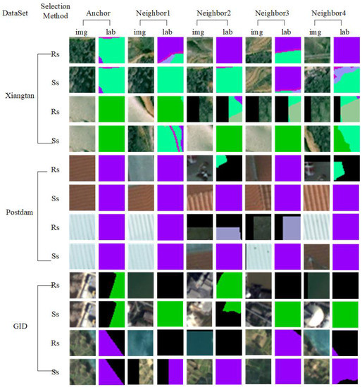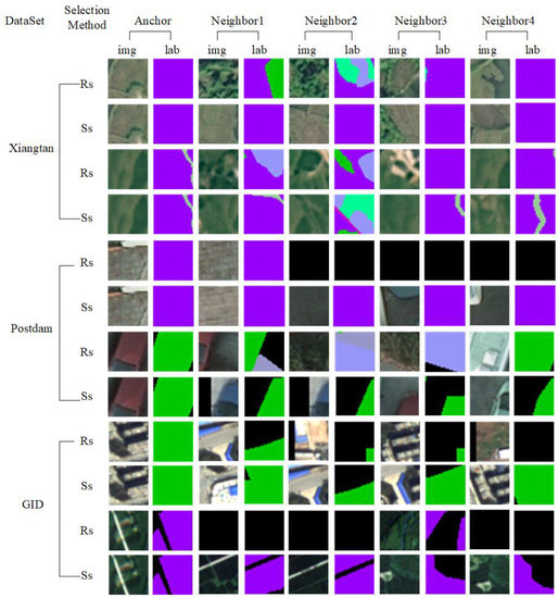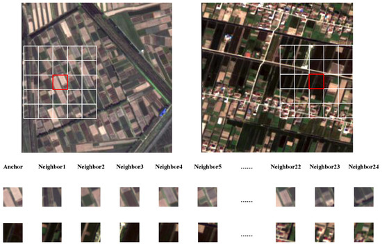 The relaxed identity sampling strategy is a self-supervised sampling strategy without labels. In order to obtain similar samples for the anchor samples, we performed the neighborhood sampling of the anchor samples by virtue of the fact that the ground objects that are closer to the anchor samples in remote sensing have a stronger correlation than those that are farther away from the anchor samples. We defined the semantic similarity index to measure whether the anchor samples had the same semantics as the samples in the sampling queue (Figure 2). In this paper, semantic similarity is defined as the label similarity between anchor samples and sampled samples. The larger the semantic similarity, the more the sample matches the expectation.