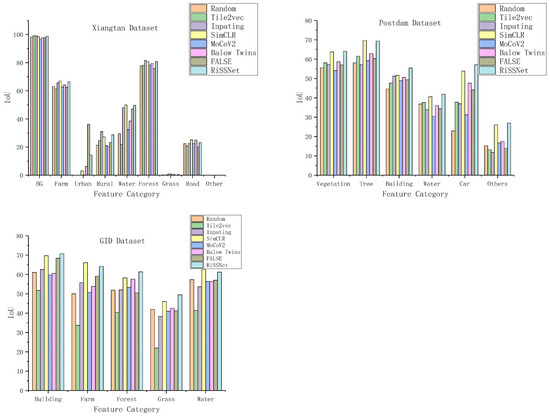 For the feature invariance augmentation validation experiments, we randomly selected some data from each dataset for feature invariance validation. Some feature categories were missing in the validation experiments for the Xiangtan dataset and Potsdam dataset because of the serious imbalance in the feature categories in these datasets. In addition, we visualized the distribution of the features learned by the different methods on the three datasets, using the GID dataset as an example, as shown in Figure 7.