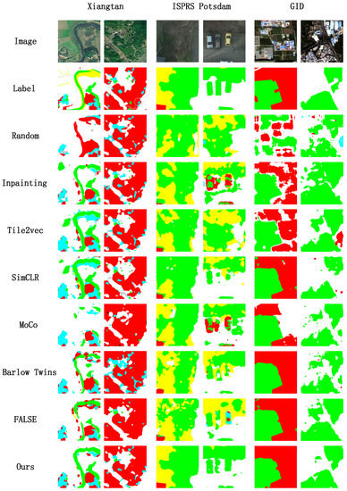 Among the methods compared above, the ’Random’ method used 1% of the data for supervised training, and the rest of the self-supervised methods used 1% of the data for fine-tuning the network. From Table 2, we can see that our method achieved improved metrics on each dataset compared to the baseline methods, especially on the GID dataset, where the mIOU was improved by 2.77%. On the Xiangtan dataset, the overall metrics of our method showed less improvement compared to the optimal baseline method, while on the GID dataset, our method showed the most improvement compared to the optimal baseline method. Next, we visualized the accuracy for each category of features in the different datasets, and it can be seen from Figure 3 that our method maintained the highest accuracy for each category of features in the three datasets. On the Xiangtan dataset, our method achieved the greatest improvements for urban and water; on the Potsdam dataset, our method showed the most significant improvement in the car category; and on the GID dataset, the improvements were more balanced due to the more balanced nature of the feature categories. In addition, we also visualized the semantic segmentation result graph Figure 4.