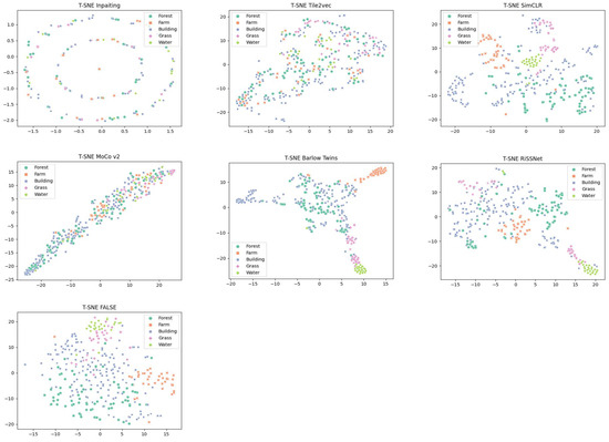 Graphs of t-SNE visualizations of the results, where differently colored dots represent different types of class objects.
