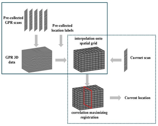 Among them, the subsurface environment map is created by collecting GPR data, followed by offline processing of the collected data. The processing involves slice interpolation, location label design, data pre-processing, etc. Finally, each slice of data is combined with the corresponding location label to obtain the map data with the location label. Real-time localization is a correlation calculation between a single frame of the subsurface data collected by the GPR in real-time and the previous map data using normalized correlation. Subsequently, the particle swarm optimization (PSO) algorithm [28] searches for the location with the highest correlation between the current data and the pre-stored grid data to obtain the localization results.