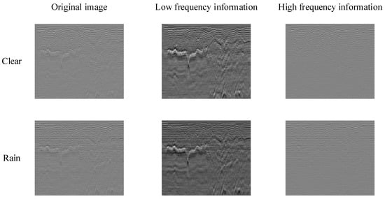 GPR image correlation in clear and rainy weather. The first and second rows show the analysis of the GPR images obtained from scanning the same road section on clear and rainy days, respectively. The left side is the raw image scanned, the middle is the low-frequency image, and the right is the high-frequency image.